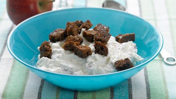 Skær rugbrødet i 1 x 1 cm store tern og hæld siruppen over, mens der vendes rundt i ternene, så det bliver godt fordelt. Rist rugbrødscroutonerne på en tør pande ved god varme, til de er sprøde, og drys med kanel. Riv æblerne på den grove side af rivejernet og vend dem i yoghurten. Server yoghurten drysset med croutonerne.