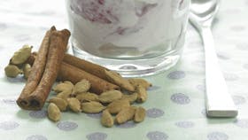 Stil yoghurten til afdrypning i køleskabet i mindst 3 timer. Skyl rabarberne og skær dem i mindre stykker. Kom rabarber, solbær, rørsukker, mynte, kanel og kardemomme i en tykbundet gryden. Varm langsomt op og lad kompotten småsimre under låg i 10 min. Tag låget af og giv kompotten yderligere 10 min., tilsæt Nonoxal og lad kompotten afkøle. Vend kompotten i yoghurten og server.
