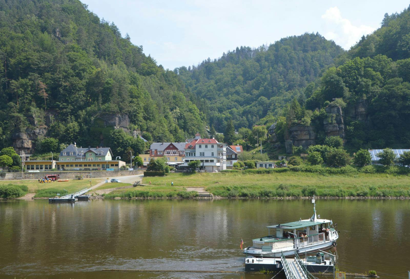 Ude på perronen følger vi tre andre passagerer ned ad en lille sti til floden og den lille færge Lena, der har ventet på toget. To minutter senere har vi krydset Elben og går i land i økolandsbyen Schmilka. Sikke en ankomst …