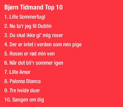 Bjørn Tidmand er i dag en institution og legende i dansk populærmusik. Indimellem er han brudt ind i andre genrer og har med succes optrådt med jazzorkestre, med evergreens, med viser og på revyscener, men det er og bliver hans mange pophits, han er landskendt for.