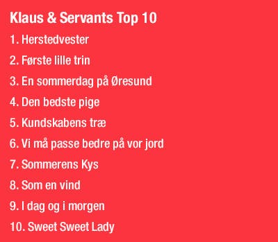 – Dengang var parolen: To singler, intet hit: Ud ad bagdøren! Så vi havde for længst opbrugt vores kvote, husker Klaus Strand-Holm fra Klaus & Servants om de unge år. Men Klaus blev ved. Heldigvis. I et halvt århundrede har vi danset til hit efter hit fra de musikalske tjenere.