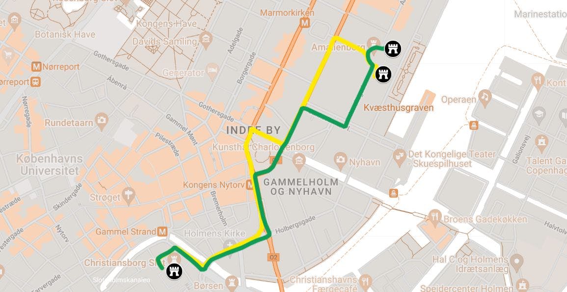 Rute: Prins Jørgens Gård, Holmens Bro, Holmens Kanal, Kongens Nytorv, Bredgade, Sankt Annæ Plads, Amaliegade, Amalienborg (se kort over ruten)